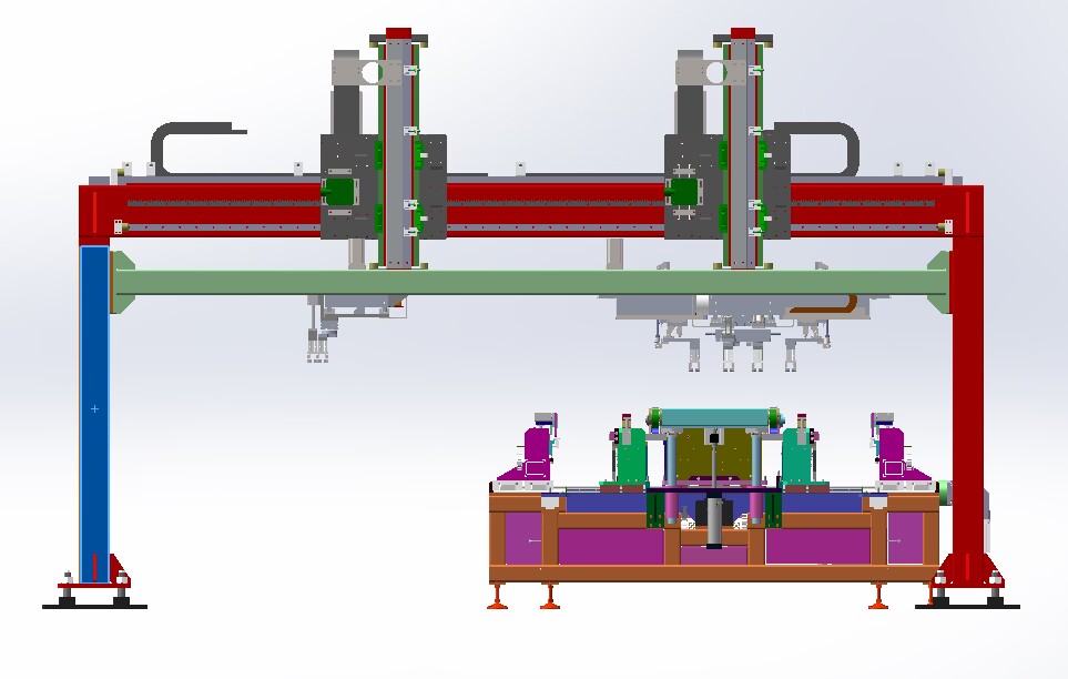自動(dòng)排版機(jī)的主要功能單元有:玻璃輸送定位系統(tǒng)、抓取行走系統(tǒng)、視覺(jué)檢測(cè)系統(tǒng)、電控系統(tǒng)等;通過(guò)以上功能單元,實(shí)現(xiàn)了將自動(dòng)串焊機(jī)串焊好的電池串,按照工藝尺寸要求和排版方向順序自動(dòng)排版鋪設(shè)到玻璃(EVA已經(jīng)鋪設(shè))上,組成電池串陣列。玻璃/EVA通過(guò)傳輸線傳輸至指定位置,機(jī)械手抓取電池串實(shí)現(xiàn)CCD定位、自動(dòng)旋轉(zhuǎn)、自動(dòng)排版功能。設(shè)備通過(guò)同步帶傳輸與自動(dòng)生產(chǎn)線對(duì)接,實(shí)現(xiàn)了自動(dòng)流水作業(yè)。